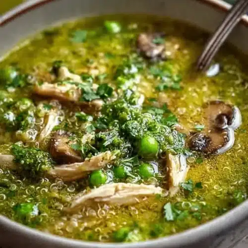 This Green Chicken Quinoa Soup with Mushrooms & Fresh Herb Paste is warm, bright, and easy to make. It uses fresh cilantro, quinoa, mushrooms, and shredded chicken for a filling bowl. The herbs give fresh flavor and lime makes it lively. You can serve it alone or with a light side such as the bang-bang salmon recipe for a fuller meal.