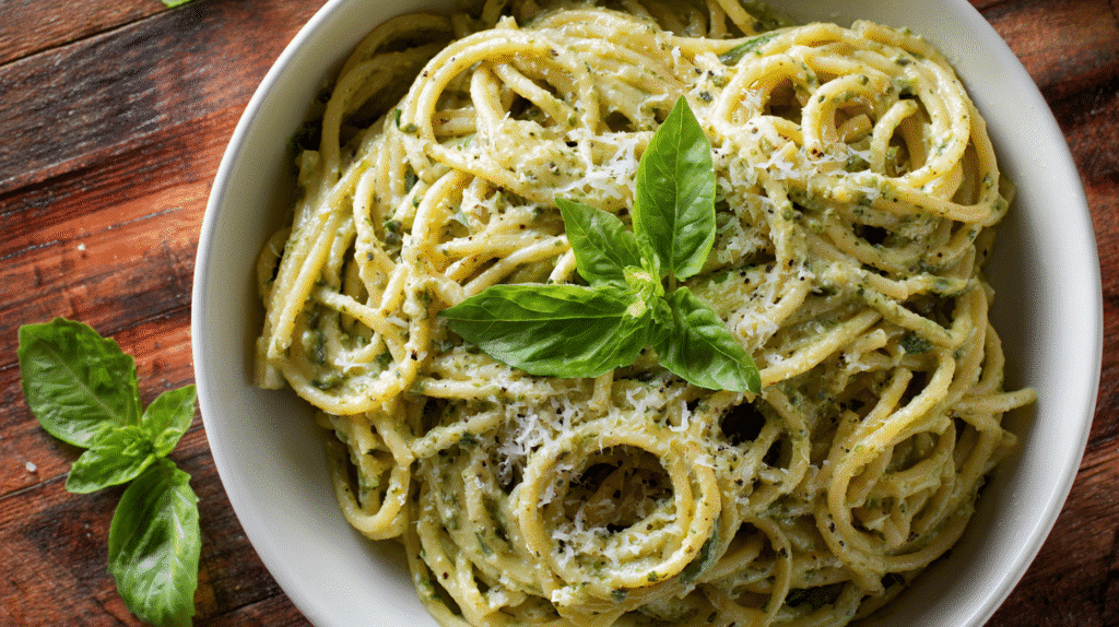 Some recipes come from long afternoons experimenting in the kitchen… and others are born on those busy days when you just need something delicious without the fuss. This creamy pesto dish came from one of those moments — a day when time was short, but the craving for comfort food was strong.